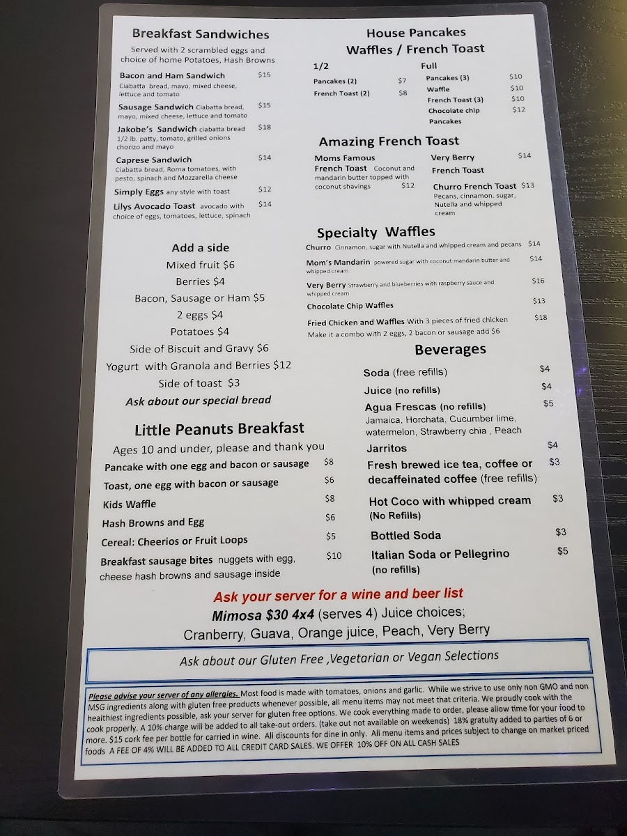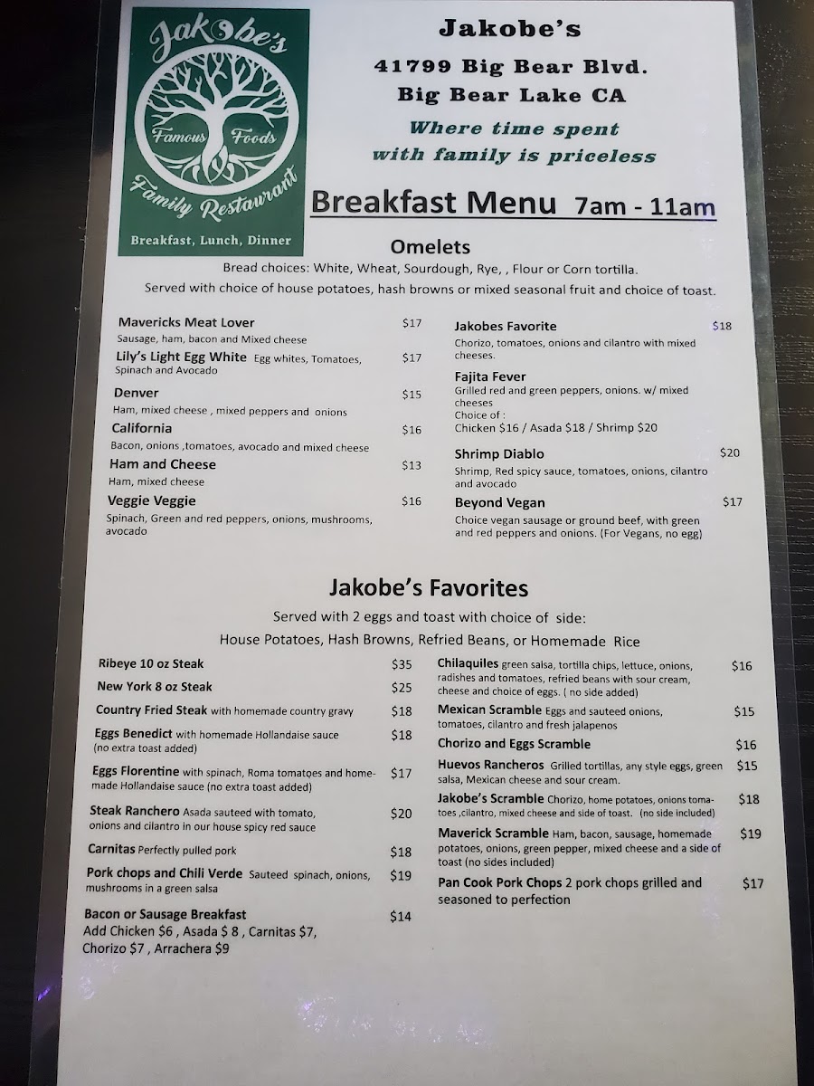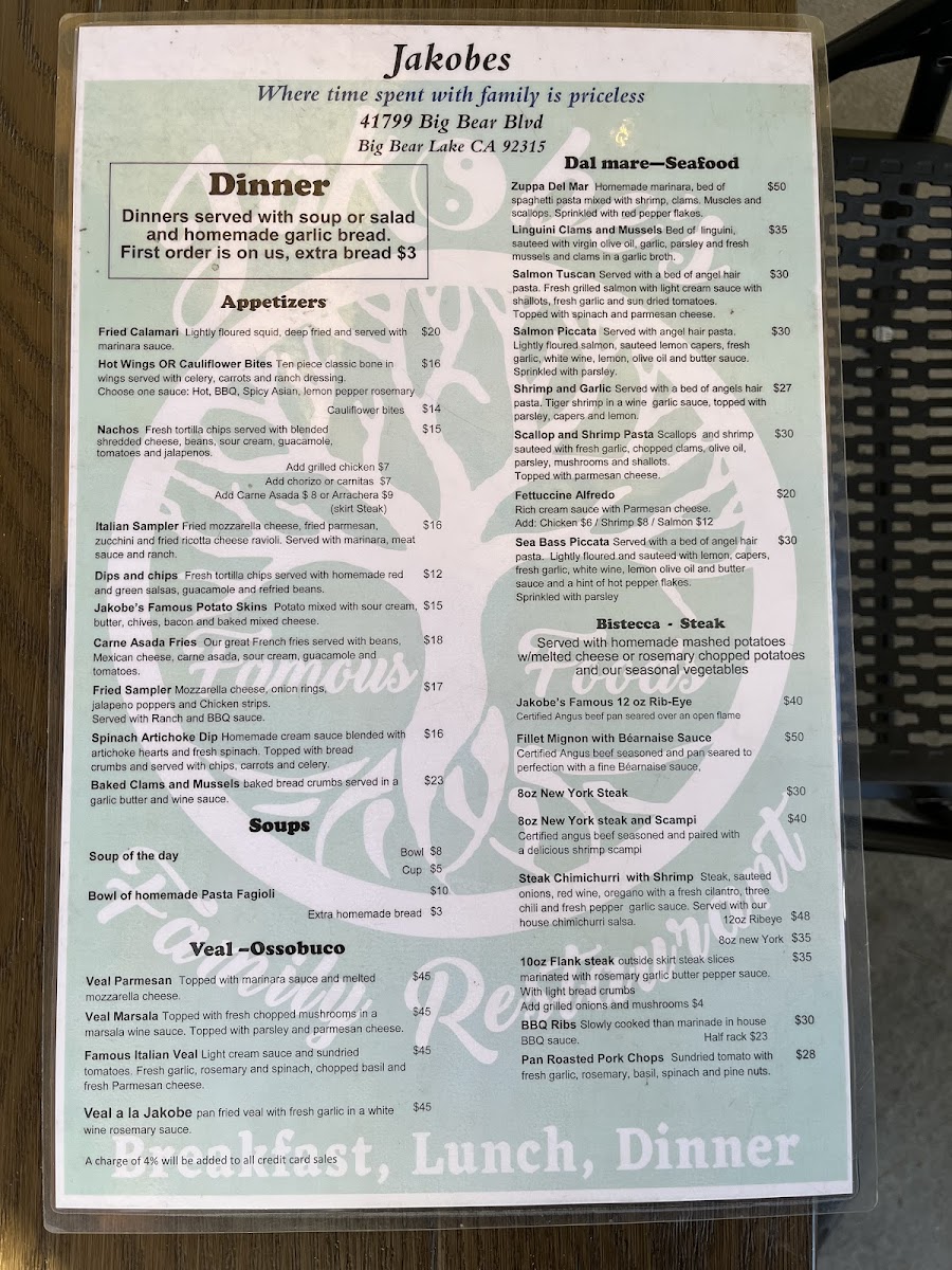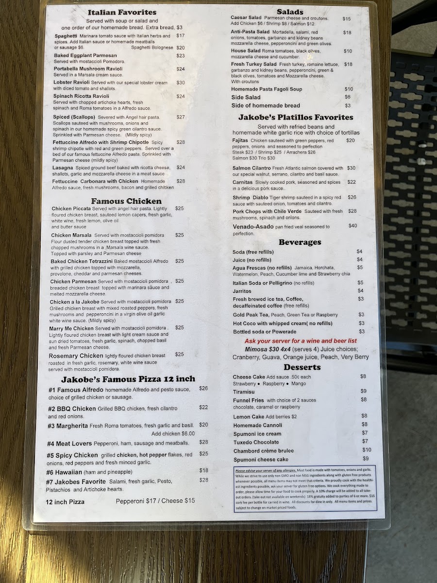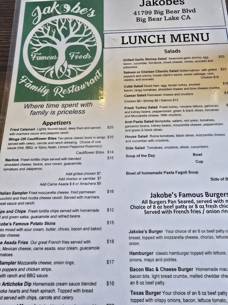 From a reviewer’s perspective, Jakobe's Famous Foods at 41799 Big Bear Blvd offers an impressively diverse menu that caters to a wide range of tastes. Their Jakobe's Platillos Favorites feature hearty options like Shrimp Diablo, Fajitas, Pork Chops With Chile Verde, Salmon Cilantro, and Venado-Asado, each crafted with bold, savory flavors. Lunch specials include comforting Italian-inspired dishes such as Lasagna, Portabella Mushroom Ravioli, and Chicken Lemon Ali Olio, alongside seafood delights like Sea Bass Piccata and Shrimp And Garlic. Burger enthusiasts will enjoy the variety in Jakobe's Famous Burgers, including the Fajita Burger, Bacon Mac & Cheeseburger, and Cali Burger. For pizza lovers, the 12-Inch Square Pizzas-ranging from Famous Alfredo to Spicy Chicken and Meat Lovers-offer generous portions and inventive toppings. Sandwiches are equally tempting, from the Chicken Parmesan Sandwich to the Famous Meatball Sub and Italian Sausage Sub, while salads such as the Cobb Salad, Grilled Garlic Shrimp Salad, and Antipasto Salad provide lighter options. Seafood is highlighted in the Dal Mare section with dishes like Fettuccine Alfredo, Scallop And Shrimp Pasta, and Zuppa Del Mar, and meat lovers can indulge in the Bistecca offerings, including Jacoby's Famous 12 Oz Rib-Eye, Pan Roasted Pork Chops, and BBQ Ribs. Desserts like Spumoni Cheesecake, Homemade Cannoli, and Funnel Fries round out the menu, complemented by beverages such as Agua Frescas, Hot Cocoa With Whipped Cream, and Gold Peak Teas. Overall, Jakobe's menu balances hearty classics with inventive twists, making it a versatile spot for both casual lunches and indulgent dinners, appealing to families, couples, and solo diners alike.